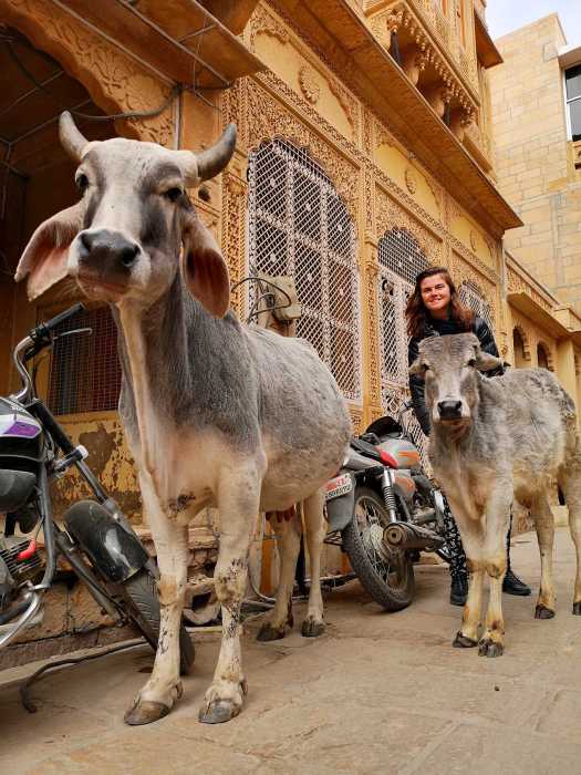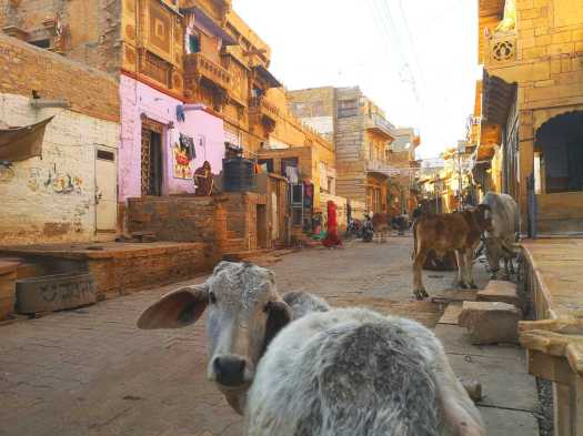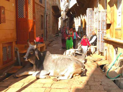La balade dans les ruelles ocres autour du fort est très agréable, on se croirait dans un film des milles et une nuits. Les façades de toutes les maisons sont sculptées minutieusement tout comme des palaces. Par contre arpenter la ville n’est pas facile… Nous devons éviter les vaches que nous croisons à chaque coin de rue. Au bout de deux semaines en Inde, cela ne nous étonne même plus.