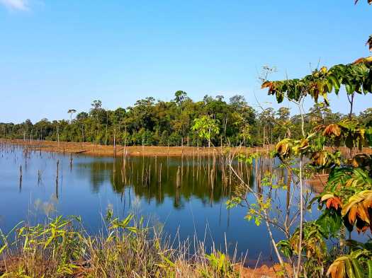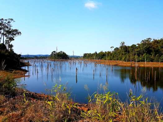Au programme du deuxième jour, 150 km ! Durant les 50 premiers km, nous traversons une zone inondée par la construction d’un barrage. Il y a des milliers d’arbres morts dans l’eau. Ce qui devrait être un spectacle désolant est au final plutôt agréable à regarder. Moins agréable pour nous, le vent s’est levé et le soleil joue à cache cache. On s’est sacrément caillé en short et en tee shirt. Pour ce périple, nous avions prévu un mini sac à dos pour deux. La doudoune et le pantalon étaient bien évidemment absents. On les a tellement regrettés !