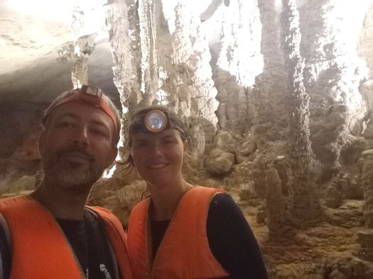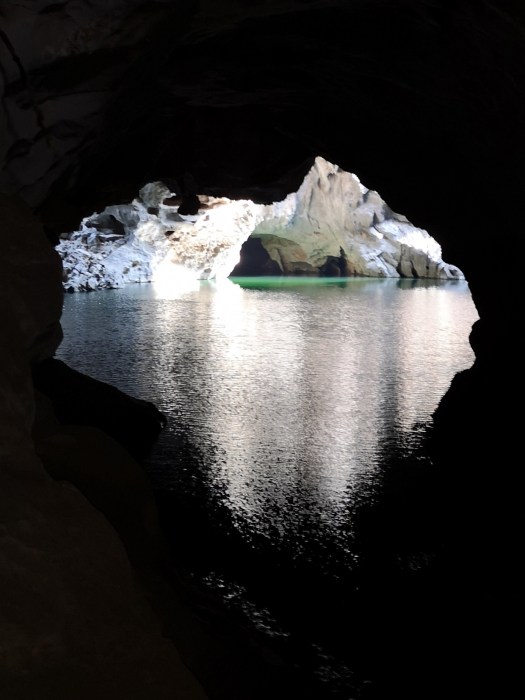 Au réveil du troisième jour, 2 œufs, 3 tartines et nous voilà prêts à partir visiter la grotte de Konglor. Longue de 7 km de long, on doit emprunter un bateau, un gilet de sauvetage et des frontales pour survivre. Vincent ne voulait pas laisser son scooter tout seul… après d’âpres négociations, nous avons trouvé un terrain d’entente… Je vous laisse juger par la suite.