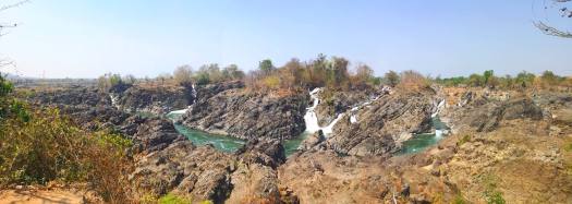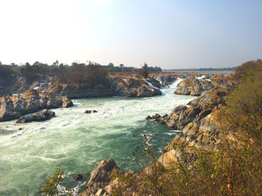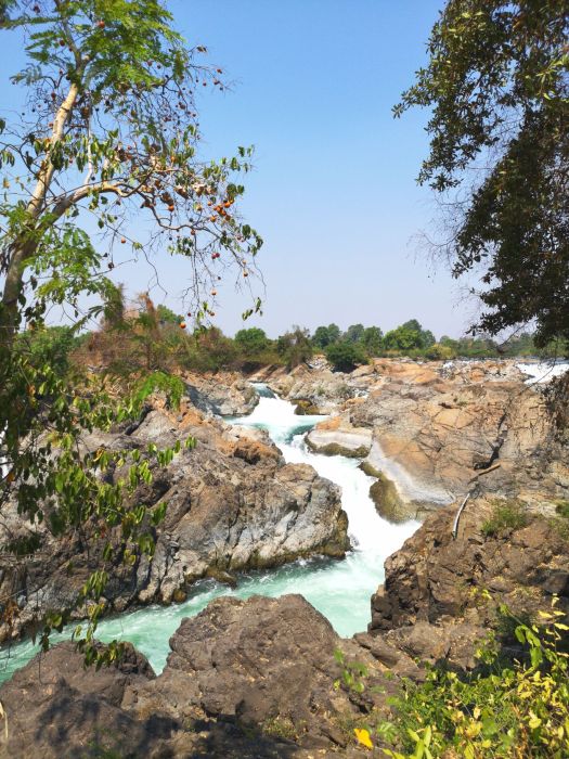 Le deuxième jour, re-grasse mat et décollage vers 13 h pour les rejoindre. Nous sommes partis en pirogue jusqu’au continent. La balade au milieu des 4 000 îles était superbe. Arrivés sur le continent, un beau tuk tuk avec des chaises de jardin nous attendait pour nous conduire jusqu’aux chutes de Khone Phapheng. Ce sont a priori les plus larges chutes du monde. La visite est agréable mais il n’y a pas beaucoup d’eau. Cela doit vraiment être impressionnant pendant la saison des pluies.