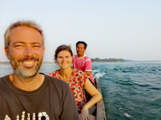 Retour à la pirogue en tuk tuk et nous voilà partis pour assister au coucher de soleil sur le Mékong. Le spectacle est grandiose… D’autant plus qu’on a la chance de voir quelques dauphins. Il faut être patient et attentif pour les voir pointer leur nez ! Nous clôturons cette journée par un apéro chez Sylvie et François où nous avons testé le Lao Lao. Cet alcool de riz est vendu très peu cher dans des bouteilles d’eau en plastique. Le plus onéreux est le coca que l’on doit ajouter pour le rendre buvable !