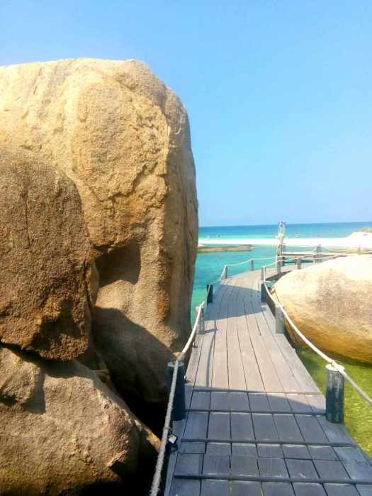 Nous avons quitté nos confortables bungalows dans un ces drôles de taxis appelés songthaew. Direction le port de Tong Sala où nous prenons un grand catamaran pour nous rendre à Koh Tao. Bye bye Phangan ! Après un peu plus d’une heure de voyage, nous accostons à Mae Haad où se situe le port.