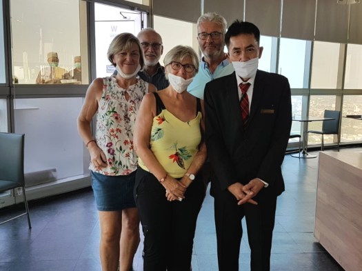 Au Baiyoke, l’accueil qui nous est réservé est princier 😲 Une armée de personnel nous salue et nous guide, notamment pour récupérer nos chambres situées au 36ème étage. Tous les quatre, nous sommes étonnés devant la complexité de fonctionnement des ascenseurs. Il nous faudra plusieurs tentatives pour comprendre et récupérer nos chambres. Les thaïlandais gèrent le Covid 19 avec beaucoup de sérieux (prise de température, distribution de gel hydroalcoolique). Dans cet ascenseur, il faut même se tourner le dos et respecter les lignes au sol (séance de rigolade assurée). Ils sont forts ces thaïlandais.