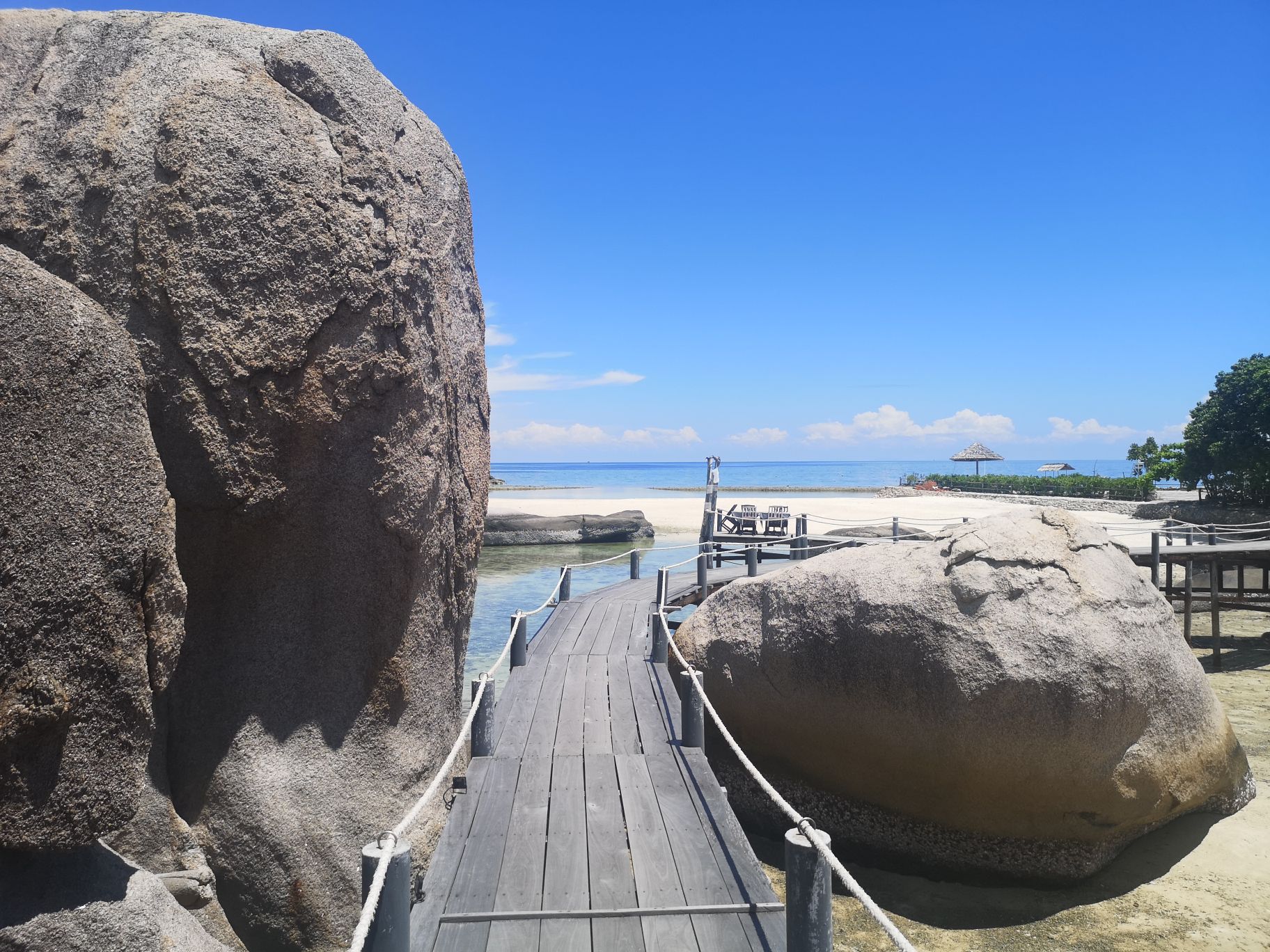 Jansom Bay est une plage privée appartenant à un hôtel de luxe. En temps normal, 6 € sont demandés aux visiteurs pour pouvoir profiter de la baignade, entourés de gros rochers aux formes arrondies à l’ombre des cocotiers. Certaines villas avec piscine privée peuvent atteindre les 1 500 € la nuit. Par chance, nous rentrons gratuitement après avoir sillonné un petit sentier ombragé et bien agréable longeant le littoral.