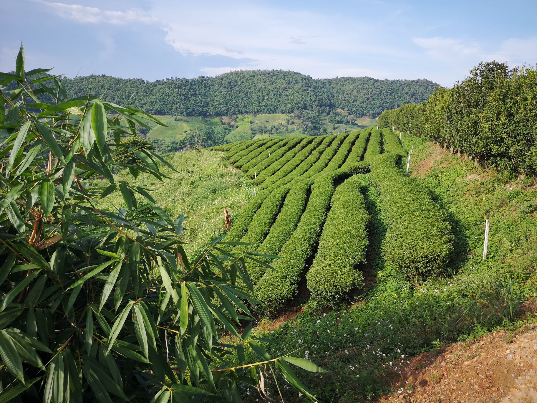 Puis nous partons à la découverte des plantations de thé. Nous nous arrêtons à celle de Wang Put Tan pour déguster le fameux breuvage. Installés à une petite table surplombant les plantations, nous pouvons observer le paysage. Les champs sont très bien entretenus et cela donne envie de s’y balader.