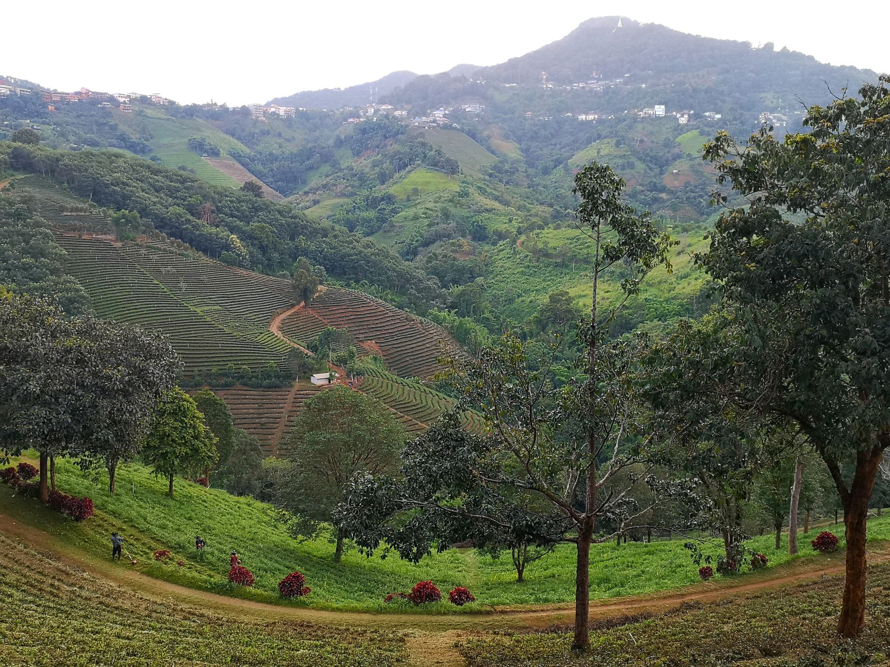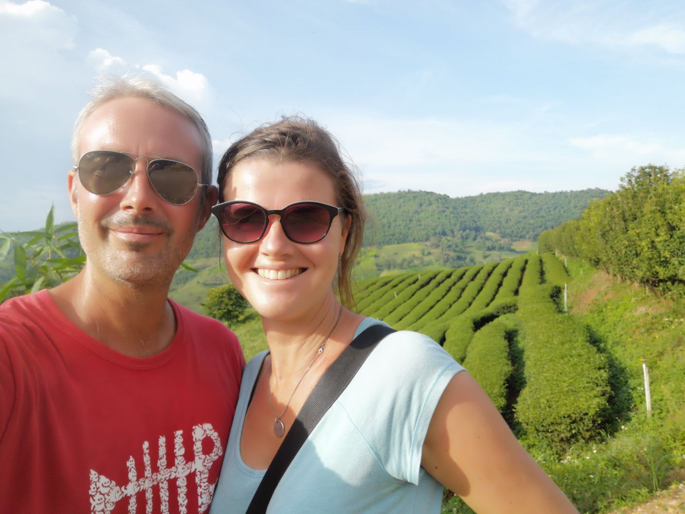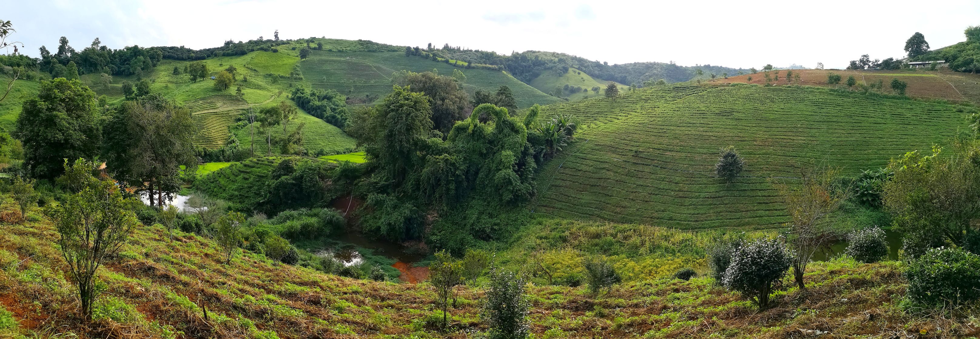 La ville de Mae Salong est connue pour ses plantations de thé. Plus on avance vers notre destination, plus on en croise. Nous nous arrêtons tout d’abord à la plantation de Chuifong. Celle-ci est une des plus grandes et des plus connues de Chiang Rai. En effet, plein de visiteurs thaïs s’y sont arrêtés. On descend de notre scooter pour apprécier la vue et on repart. Il y a trop de monde pour déguster un thé !