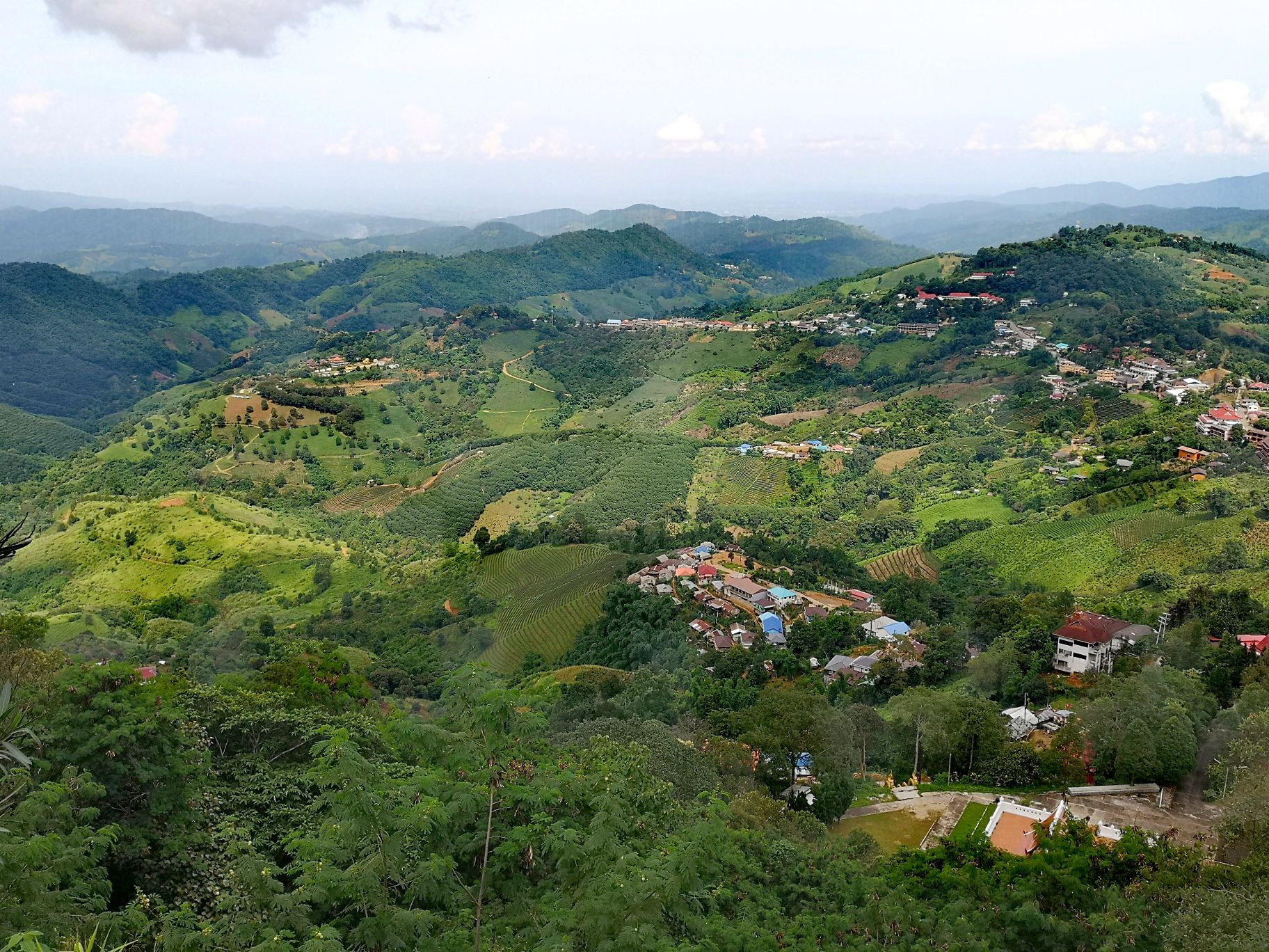 Sur la route, on apprécie les innombrables jolies vues. Les plantations de thé ont remplacé les rizières. Tout est vert ! Nous arrivons à notre hôtel, déposons nos sacs et repartons directement pour visiter la ville de Mae Salong.