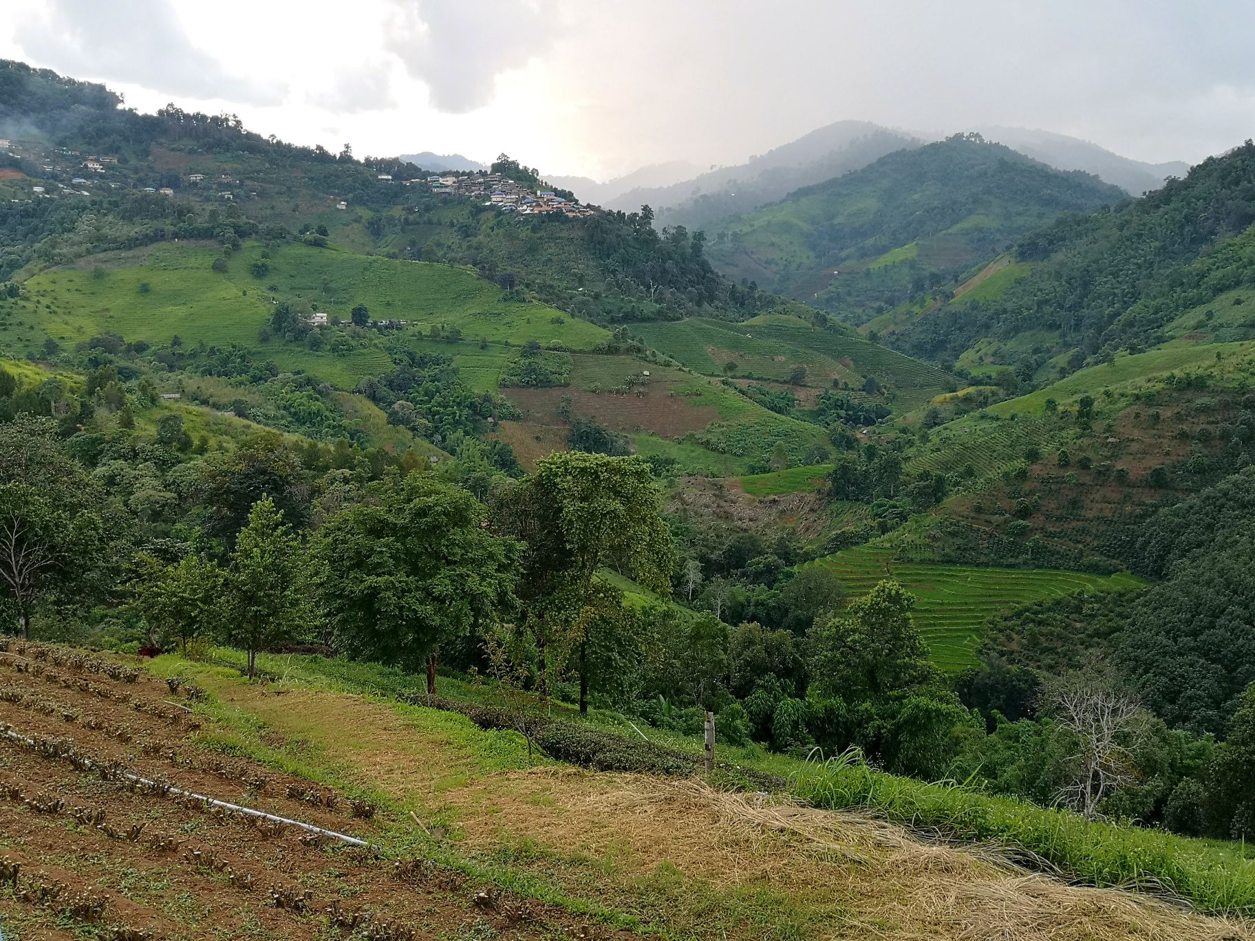 A ce moment là, nous sommes à quelques mètres de la frontière avec le Myanmar. Nous nous arrêtons à un poste de frontière, c’est fou de se dire que de l’autre côté du grillage, c’est un autre pays ! Puis on longe la frontière sur la crête de la montagne durant 15 km. Les paysages sont magnifiques et Vincent gère bien la conduite. On s’arrête boire un thé thaï dans un joli village afin de reprendre du poil de la bête car il nous reste encore un peu de route.