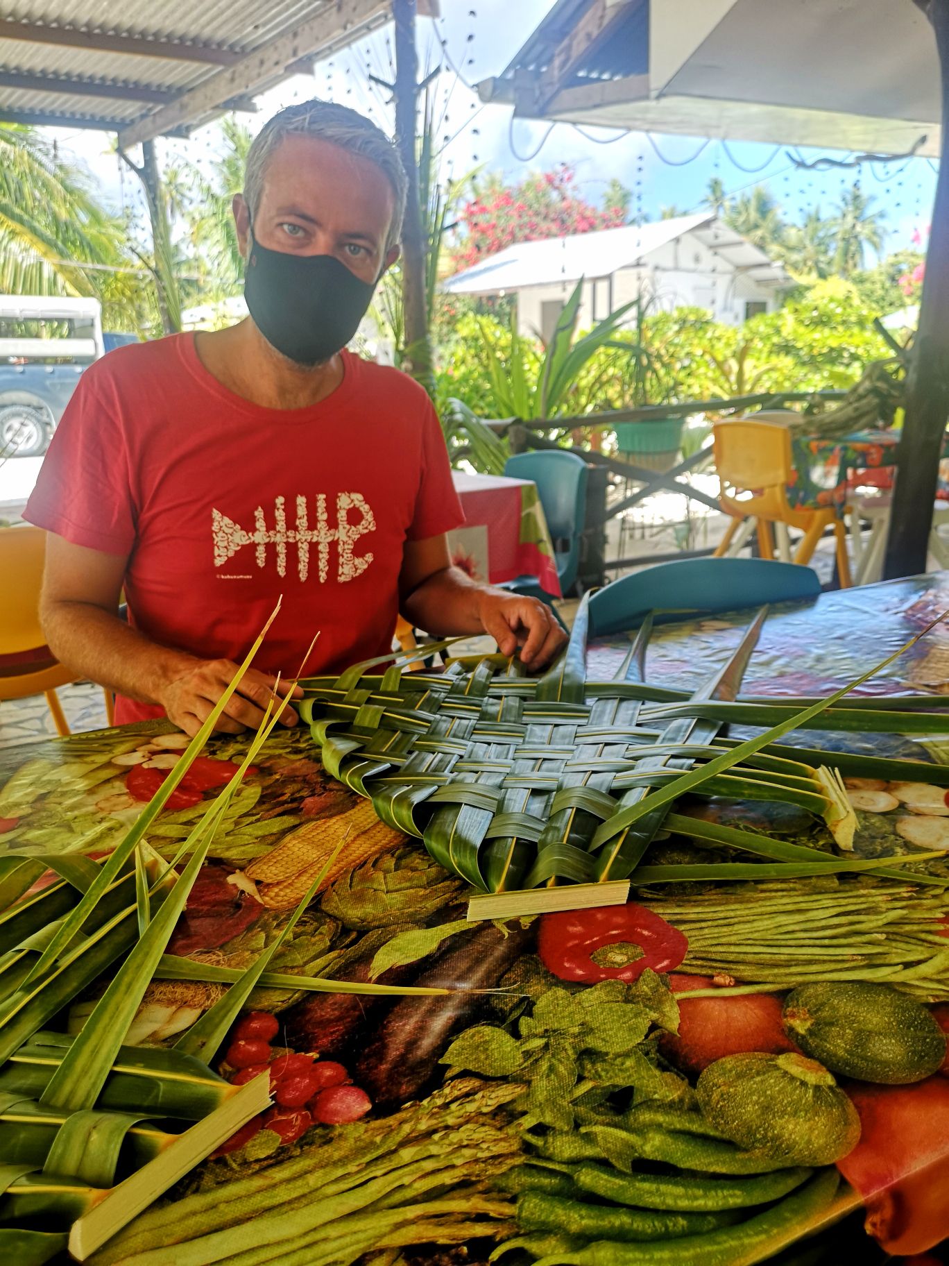 Une fois le ventre plein, on nous annonce que l’on doit fabriquer nos assiettes en palme de cocotiers pour le midi. On écoute attentivement les explications et on ne s’en sort pas trop mal ! Ça a l’air facile quand on entend la dame dire « en dessous, en dessus » mais ce n’est pas si simple. Nos assiettes sont trop belles, je suis certaine que le repas sera encore meilleur.