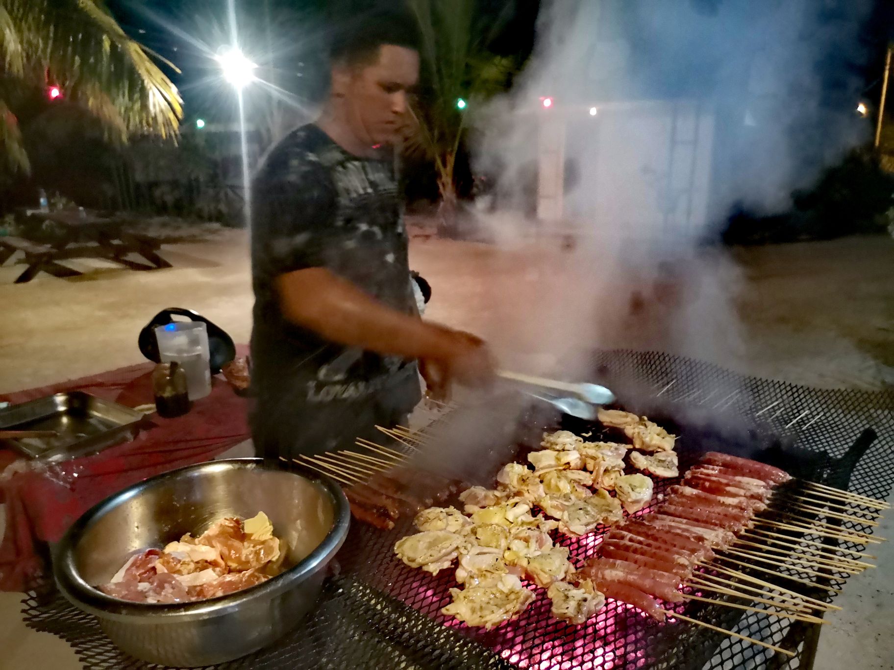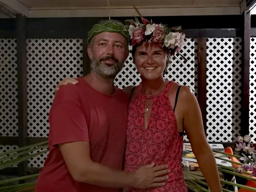 On ne s’attarde pas trop longtemps car c’est l’heure de la soirée tahitienne organisée par la pension ! Chaque fille reçoit une couronne de fleurs et chaque garçon une couronne en palme de cocotiers. On est trop beau n’est-ce pas ? Ce soir, c’est la fête, on mangera un barbecue avec du poulet, des saucisses, et des cœurs de bœuf (pour ceux qui veulent…) et bien sûr des frites ! Miam miam, ça change du poisson !