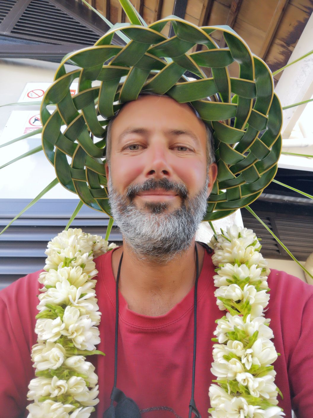Retour au bungalow pour une douche rapide et il est temps de rendre les clés. Nous déjeunons tous ensemble et nous quittons les lieux direction l’aéroport. Mais avant ça, on nous couvre de cadeaux !! Je repartirai avec une couronne et un collier en fleurs de tiare et Vincent un beau chapeau et un collier ! On est ravissant n’est ce pas?