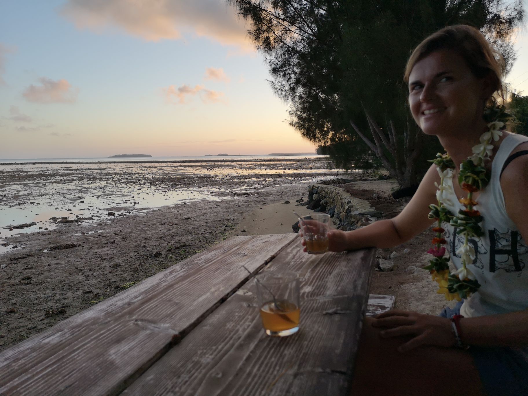 Nous prenons un petit verre face au lagon en attendant l’heure du repas. On découvre au passage qu’ici, les locaux trempent leur régimes de bananes dans l’eau de mer avant de les suspendre. Cela évite qu’ils se fassent grignoter par des bêtes.