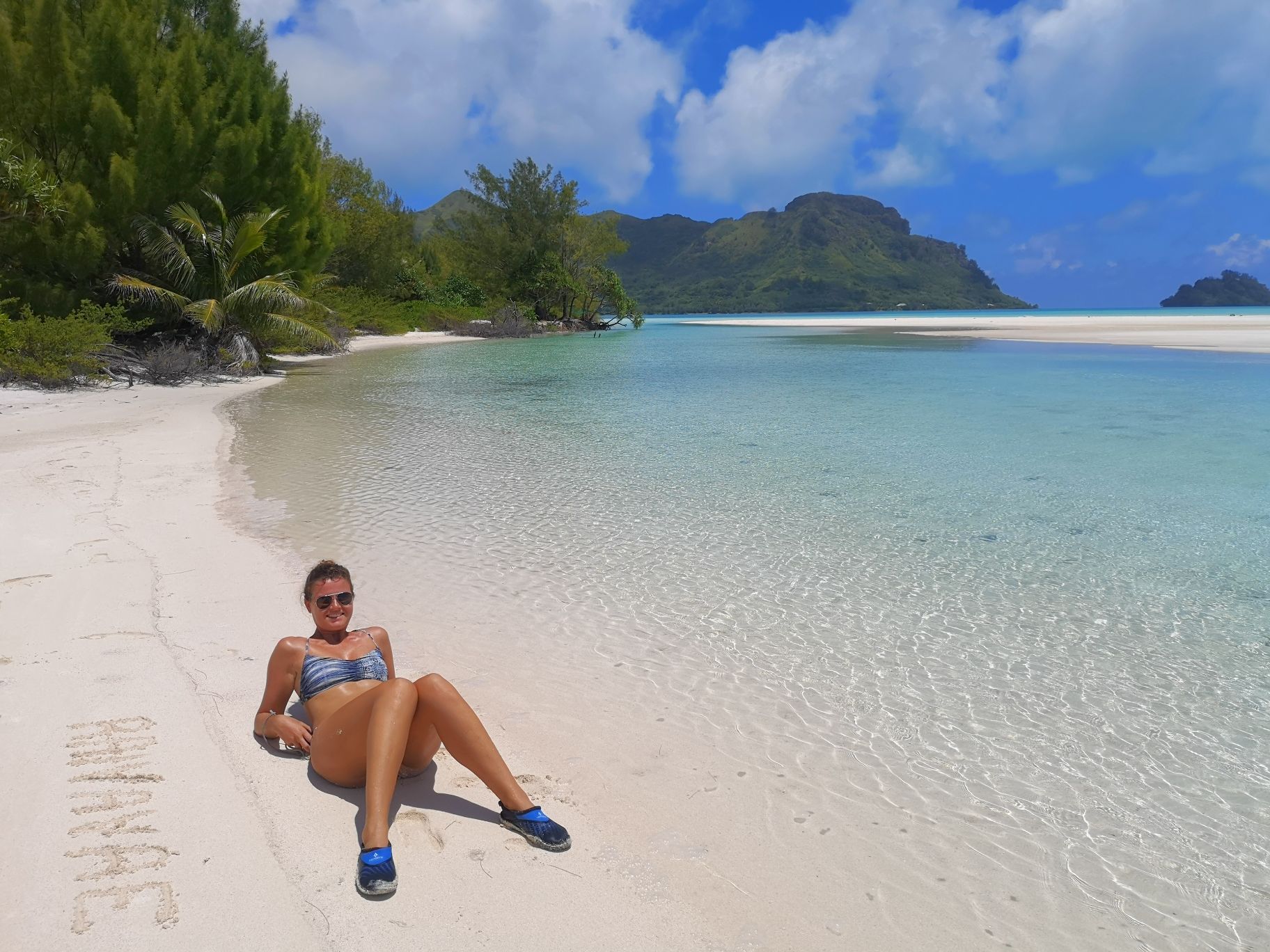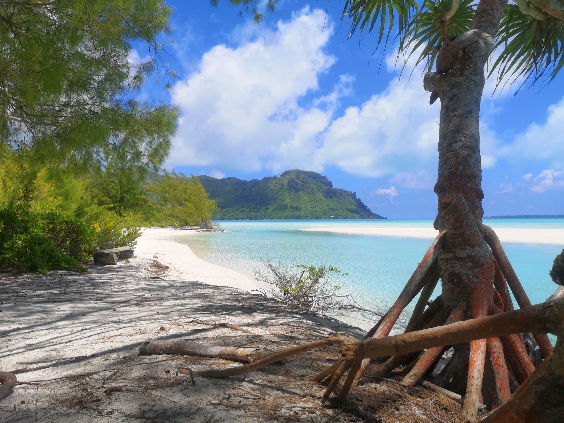 On barbote dans le lagon en attendant que notre capitaine nous récupère pour aller sur leur motu privé. Comme nous avions pris un copieux petit déjeuner, nous préférons partir nous balader plutôt que de manger du bénitier. Alexane est ravie d’esquiver ce met paraît il délicieux. Pour ceux qui ne connaissent pas, c’est un coquillage contenant un énorme mollusque à l’intérieur.