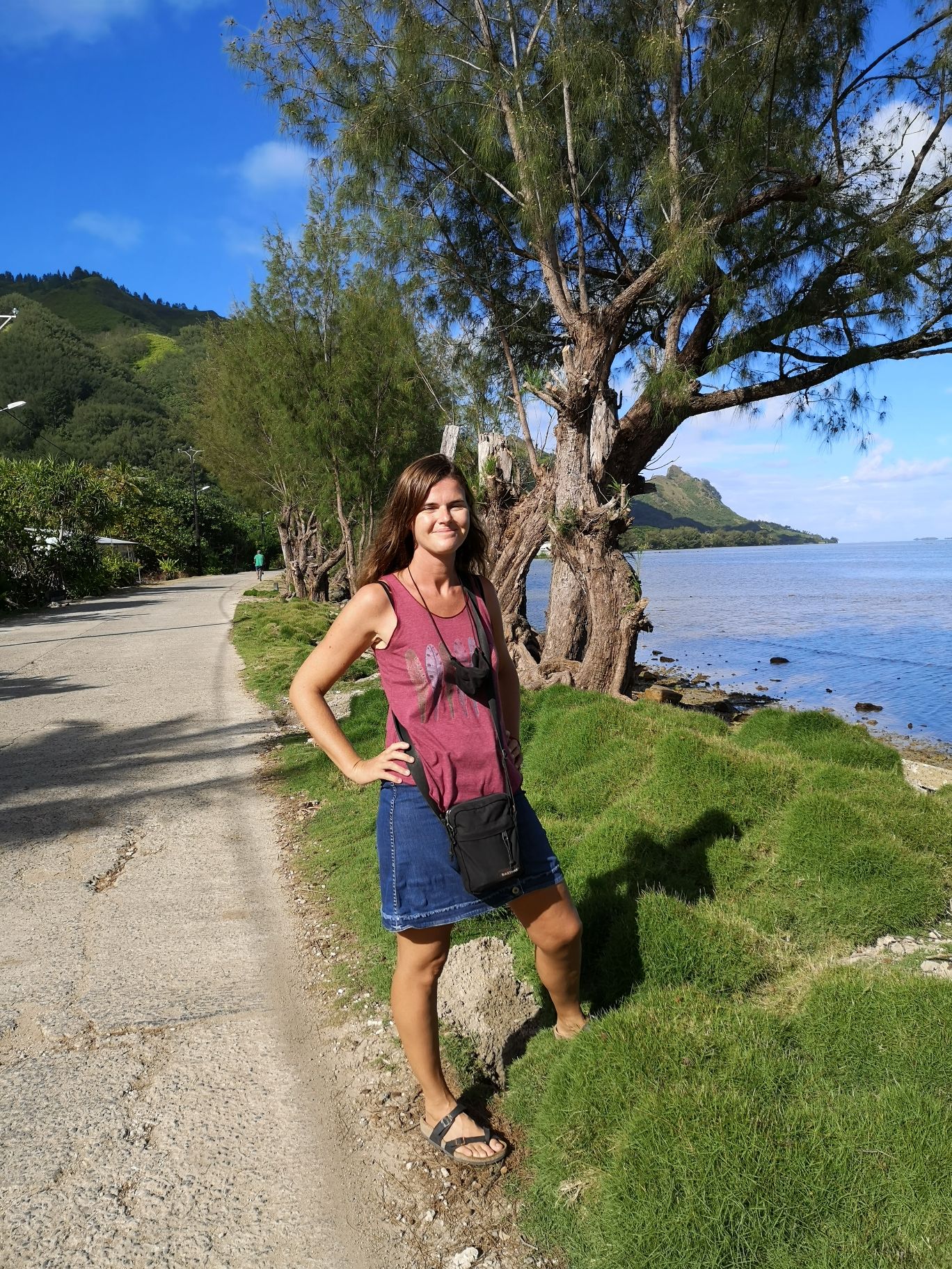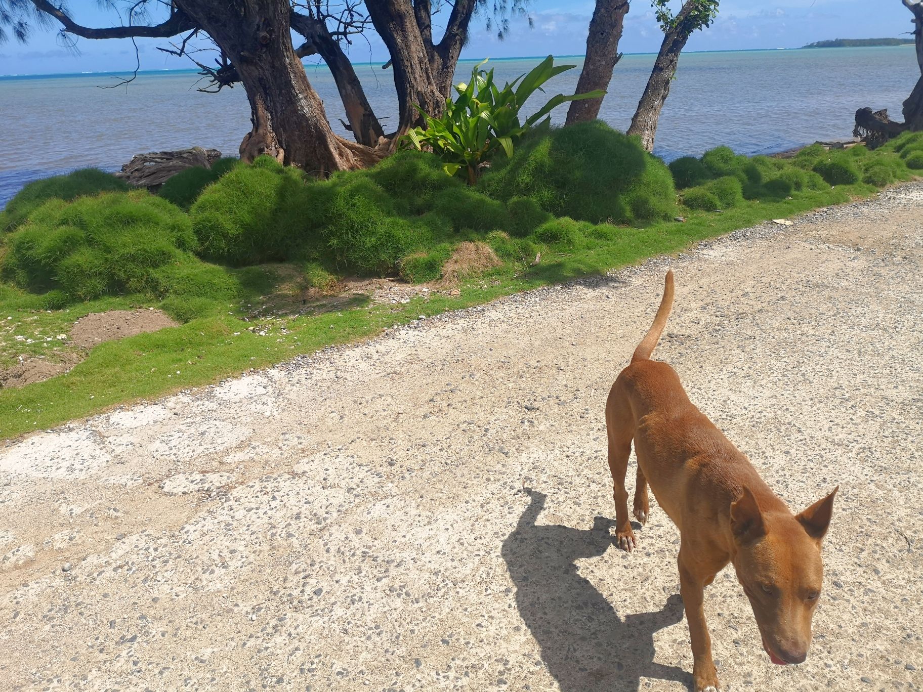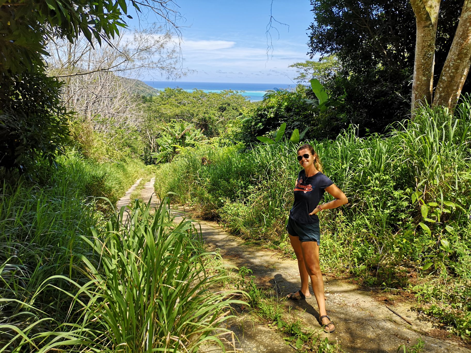 Pour occuper notre dernière journée, on part faire la route de la traversée de l’île. Ça grimpe sec sur une route en béton qui traverse des forêts de pins. On a de jolies vues sur le lagon. Au bout de la route, on décide finalement de ne pas repasser par ce chemin est de faire le retour par le bord de mer. On est rentré rincé car cela fait tout de même 15 km en claquettes.