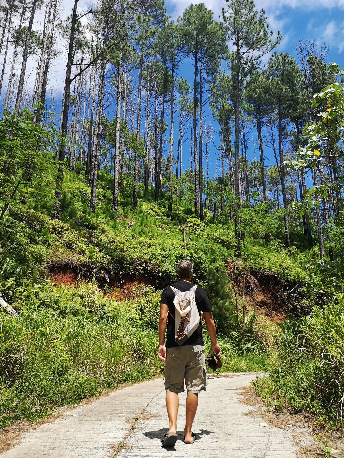 On nous montre le sentier de départ accompagné d’un « bon courage ». Dès le début, ça grimpe fort dans une forêt de pin. Heureusement qu’un gros câble électrique en guise de corde nous permet de grimper.
